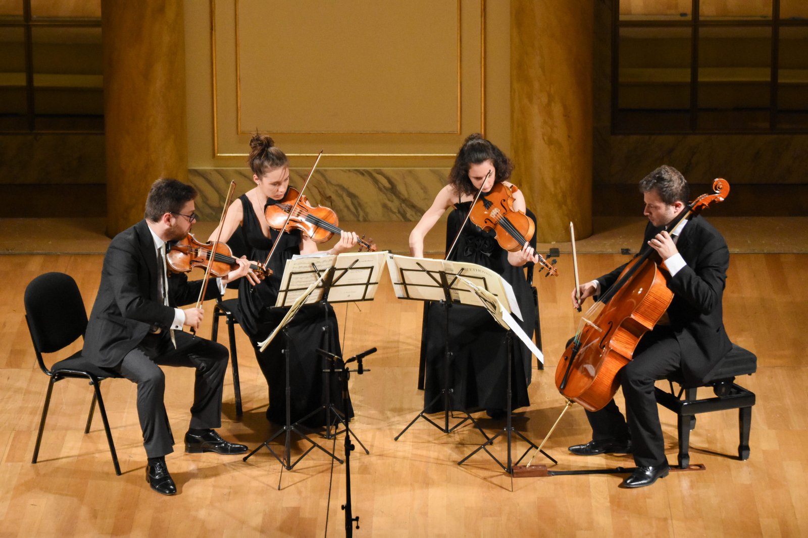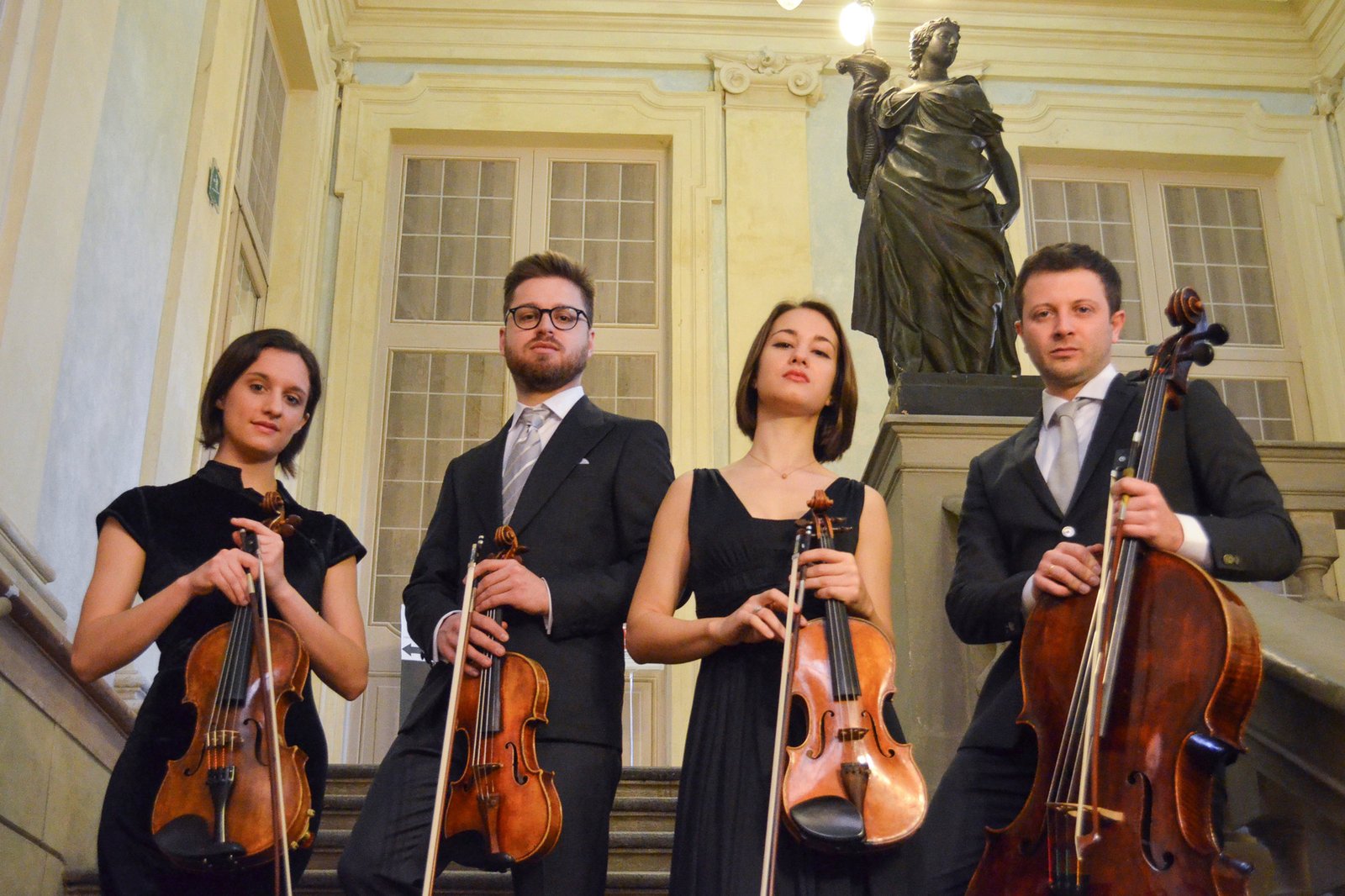 Il Quartetto Adorno si è fatto conoscere a livello internazionale aggiudicandosi il Terzo Premio (con Primo non assegnato), il Premio del Pubblico e il Premio Speciale per la migliore esecuzione del brano contemporaneo di Silvia Colasanti nell’edizione 2017 del Concorso Internazionale Premio Paolo Borciani. Nella storia trentennale del Concorso nessun quartetto italiano aveva ottenuto un riconoscimento così importante. Fondato nel 2015 da Edoardo Zosi, Liù Pelliciari, Benedetta Bucci e Danilo Squitieri, si è perfezionato presso la Scuola di Musica di Fiesole. Tutti i suoi singoli componenti si sono perfezionati presso l’Accademia Chigiana. Il nome del Quartetto è un omaggio al filosofo Theodor Wiesengrund Adorno che, in un’epoca di declino musicale e sociale, individuò nella musica da camera una chiave di salvezza per perpetuare un vero rapporto umano. Il Quartetto Adorno ha tenuto concerti per importanti società musicali italiane ed estere e collabora con grandi artisti quali: P. Badura-Skoda, B. Canino, A. Carbonare, S. Gramaglia, F. Meloni, P. Meyer, G. Sollima.